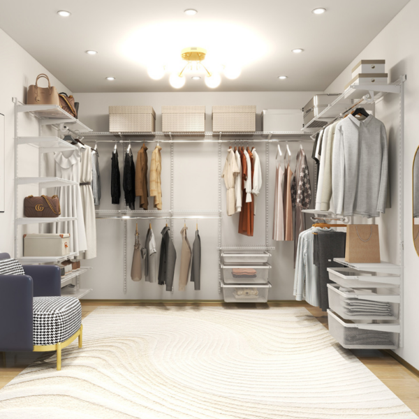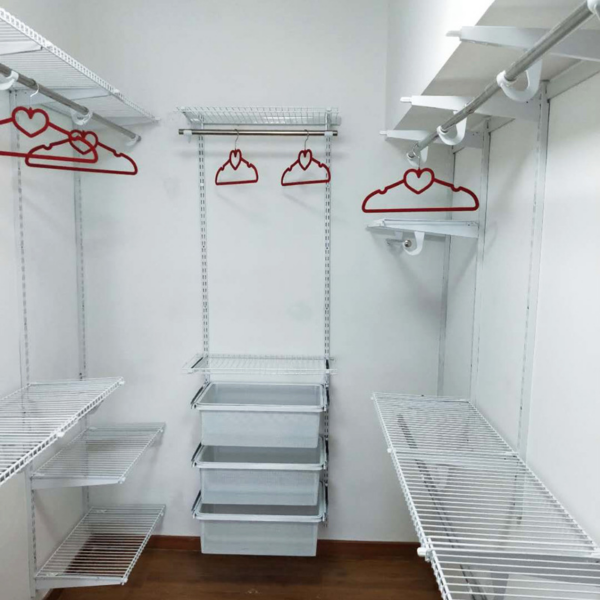 An eco-friendly, modern open metal wardrobe for the bedroom. Perfect for creating a spacious and organized walk-in closet with a sleek design.